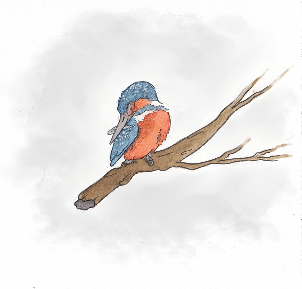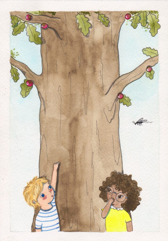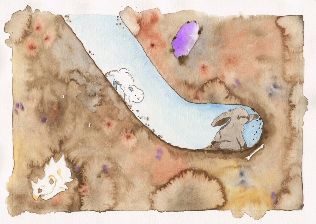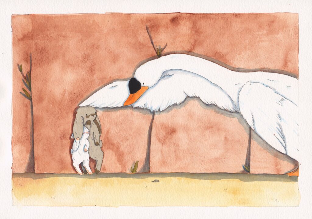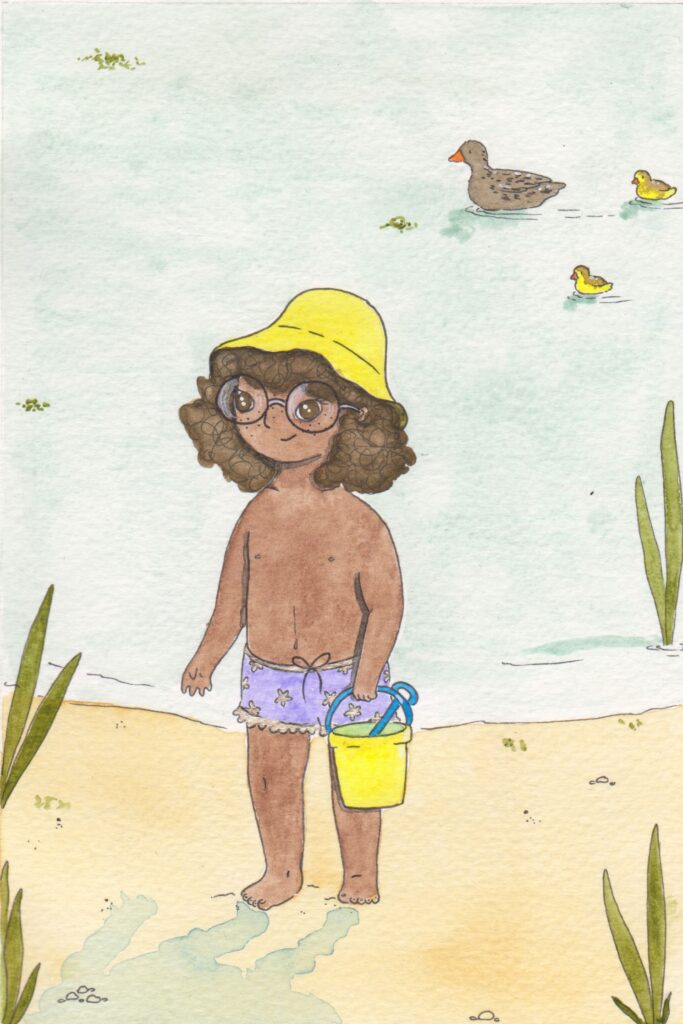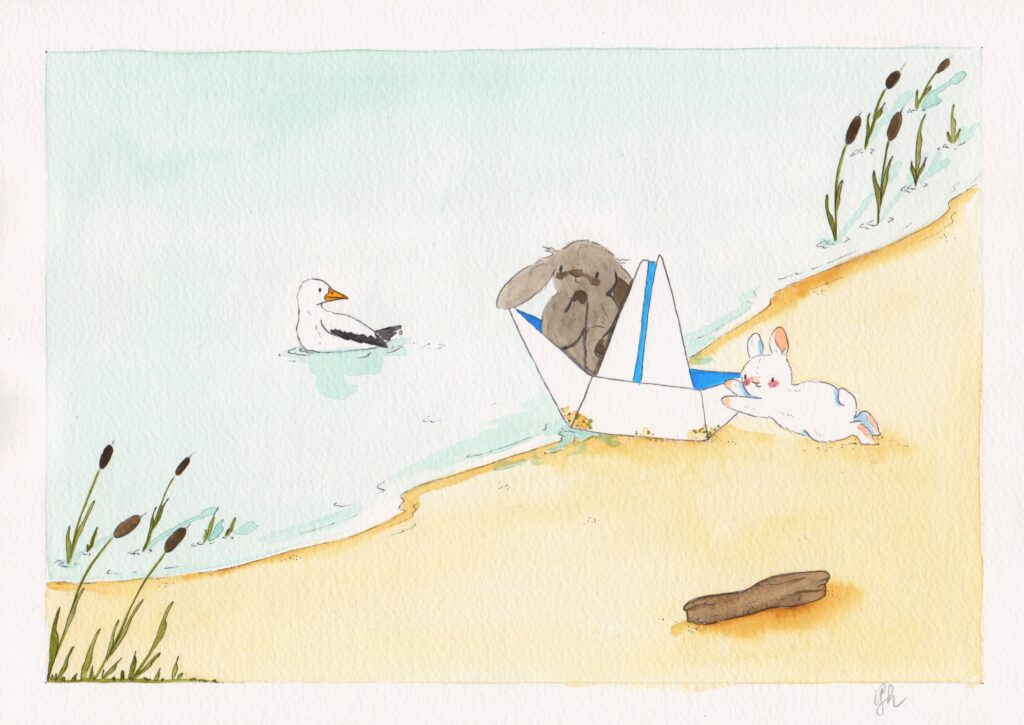 Illustraties voor het boekje Bibi en Teun van Marlijn Simons-Somhorst. Potlood, fineliner en verf op 300g/m aquarelpapier (afbeeldingen op A4-A5 formaat), nabewerkingen in Krita, samenstelling boek in Adobe InDesign.
